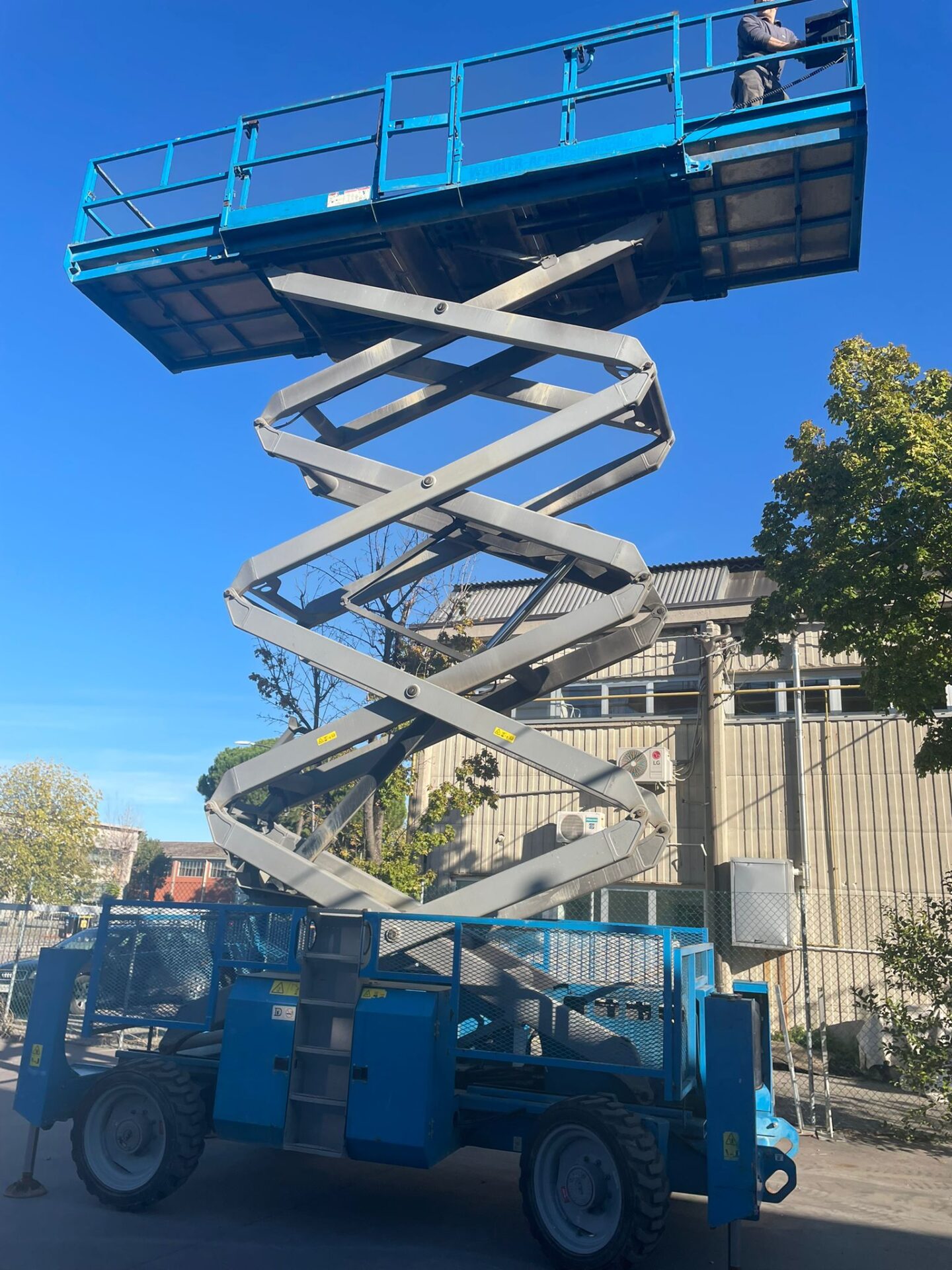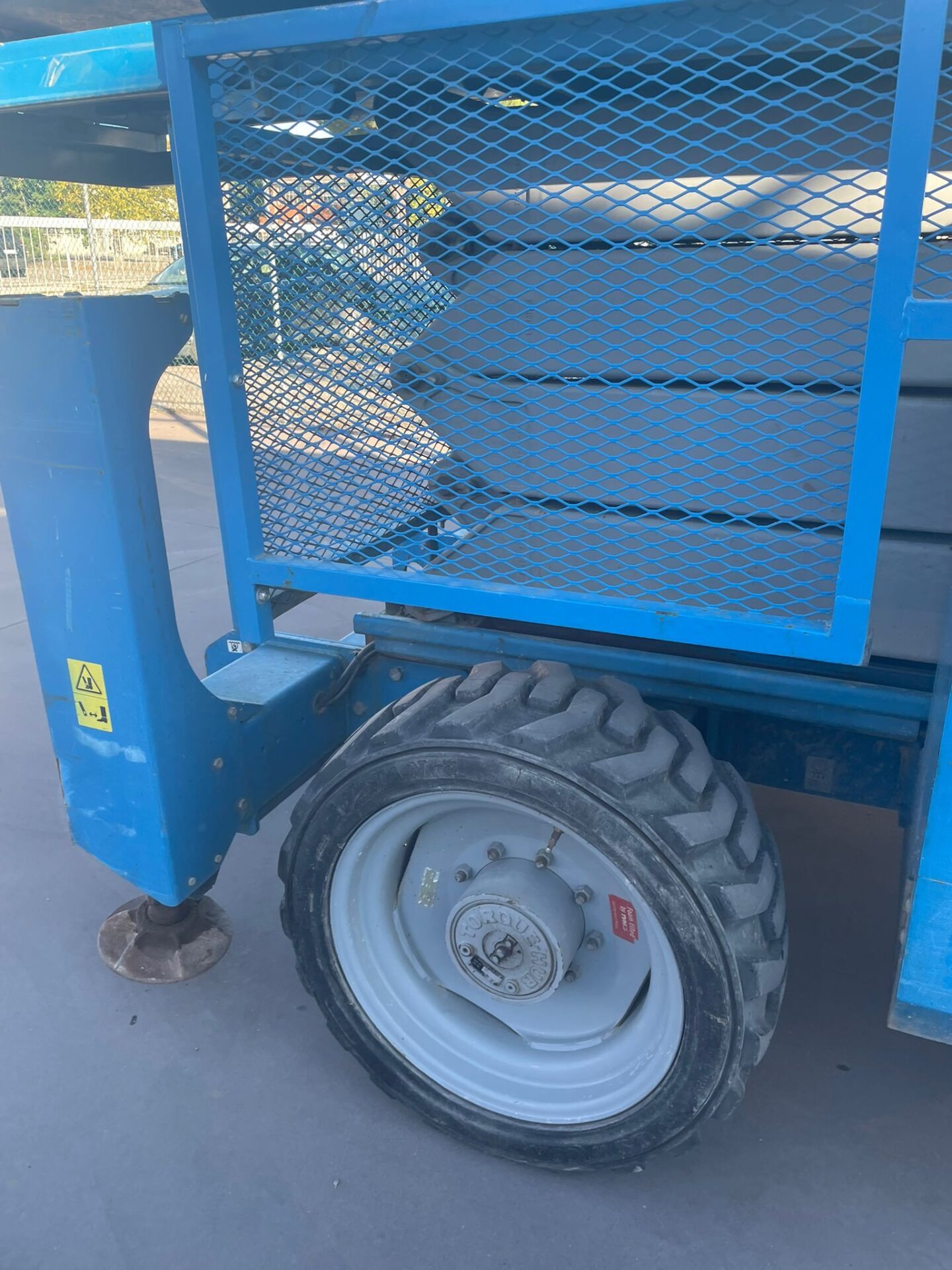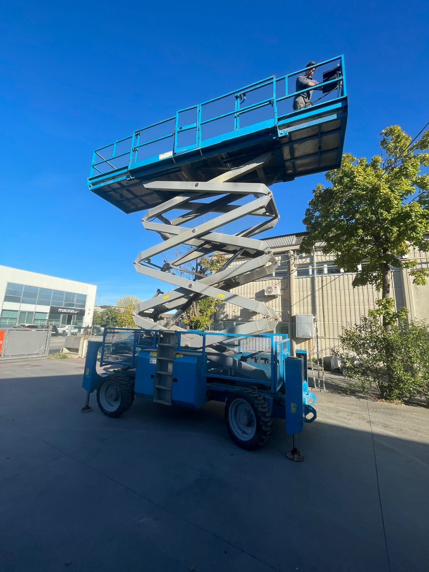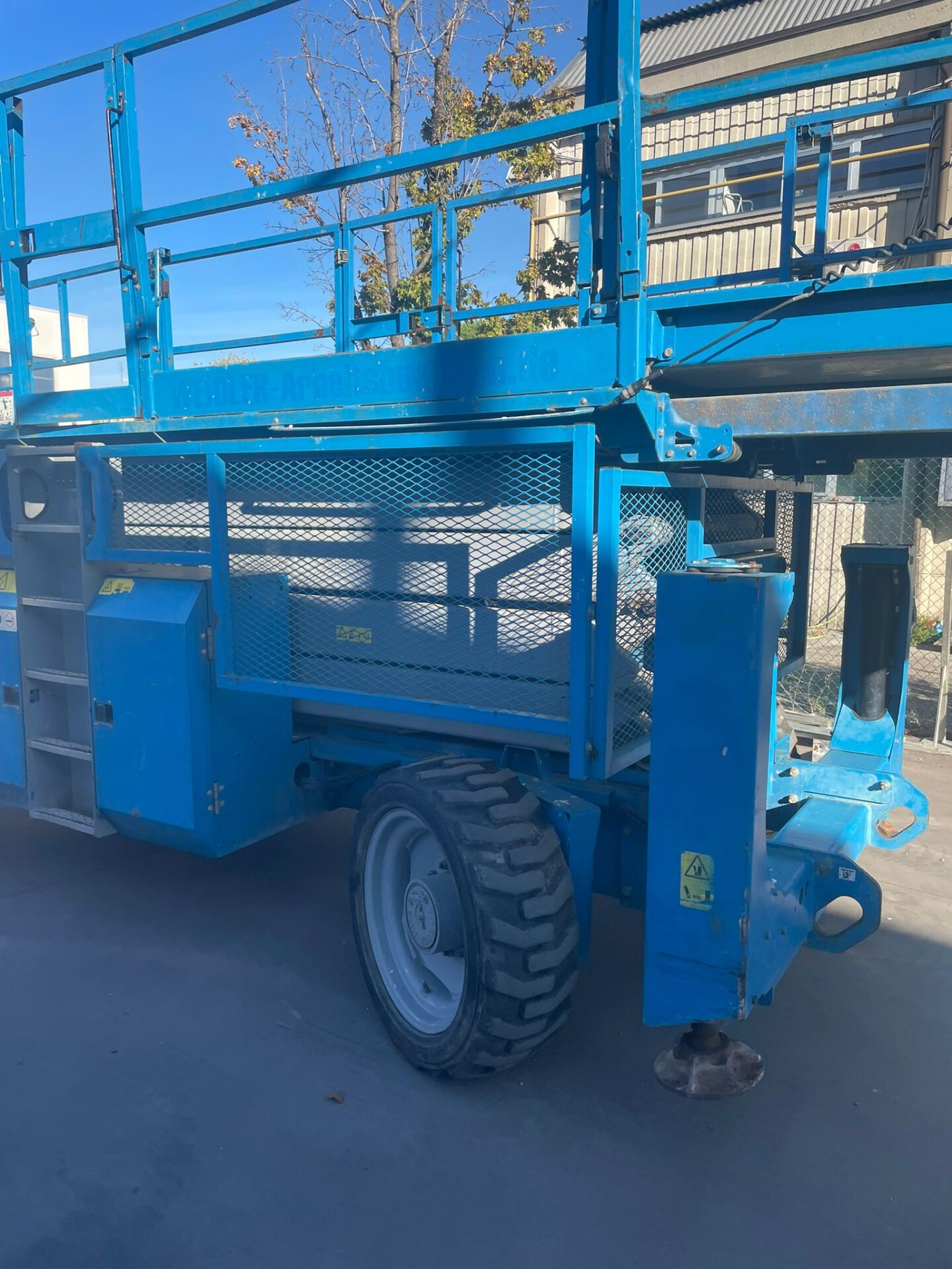 Piattaforma aerea usata verticale a pantografo diesel GENIE GS-4390, raggiunge 15mt di lavoro, anno 2009, con stabilizzatori e ruote 4×4, adatta su ogni tipologia di terreno.