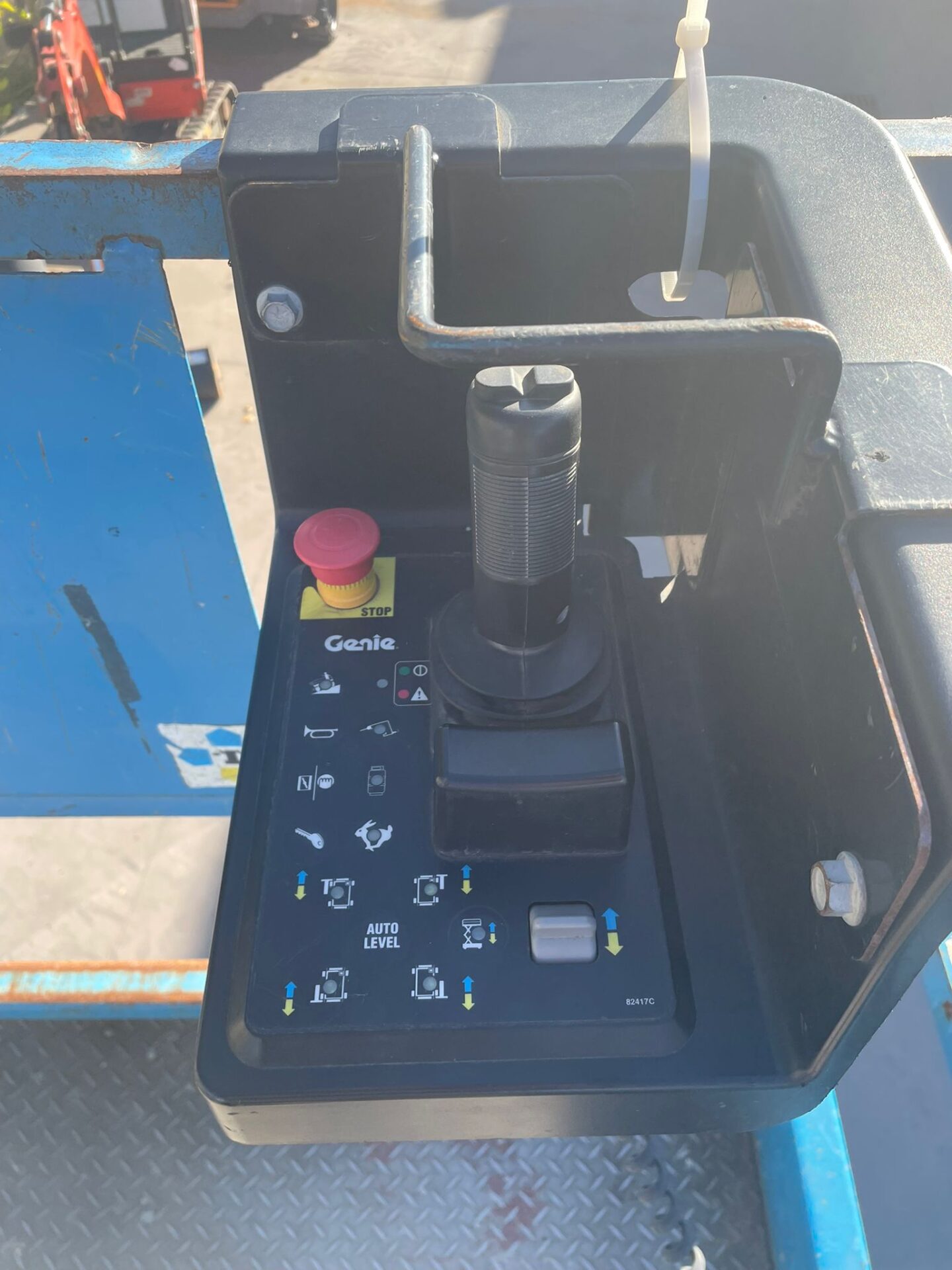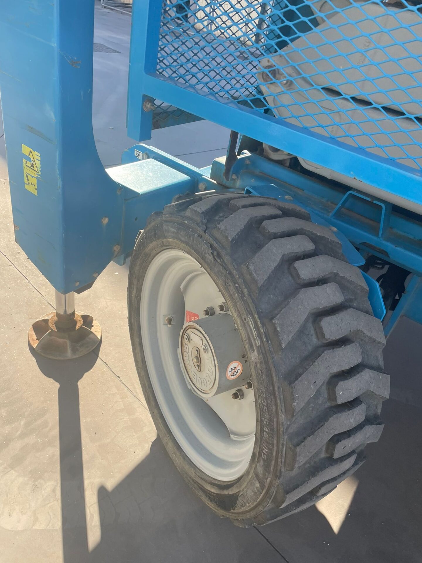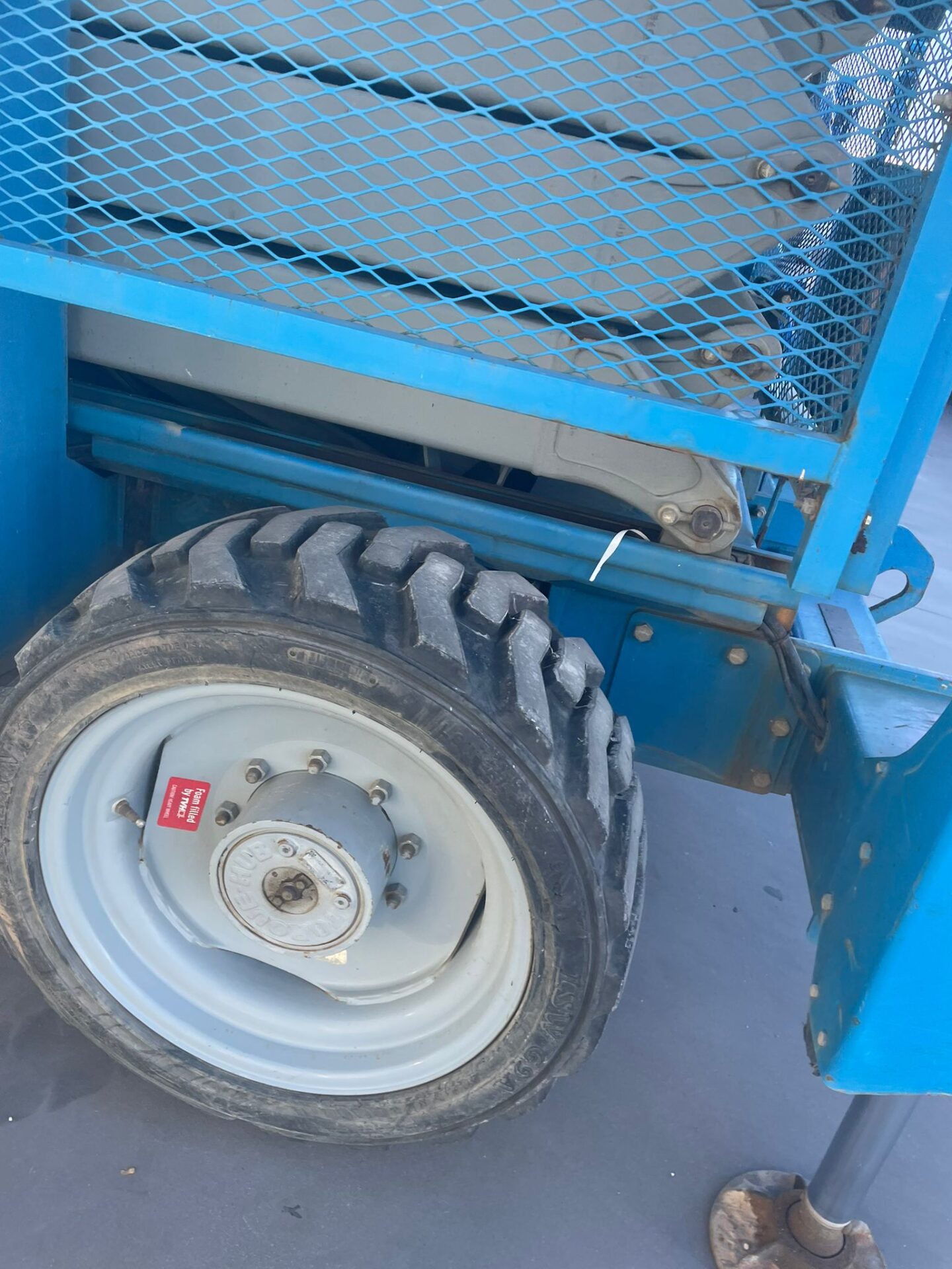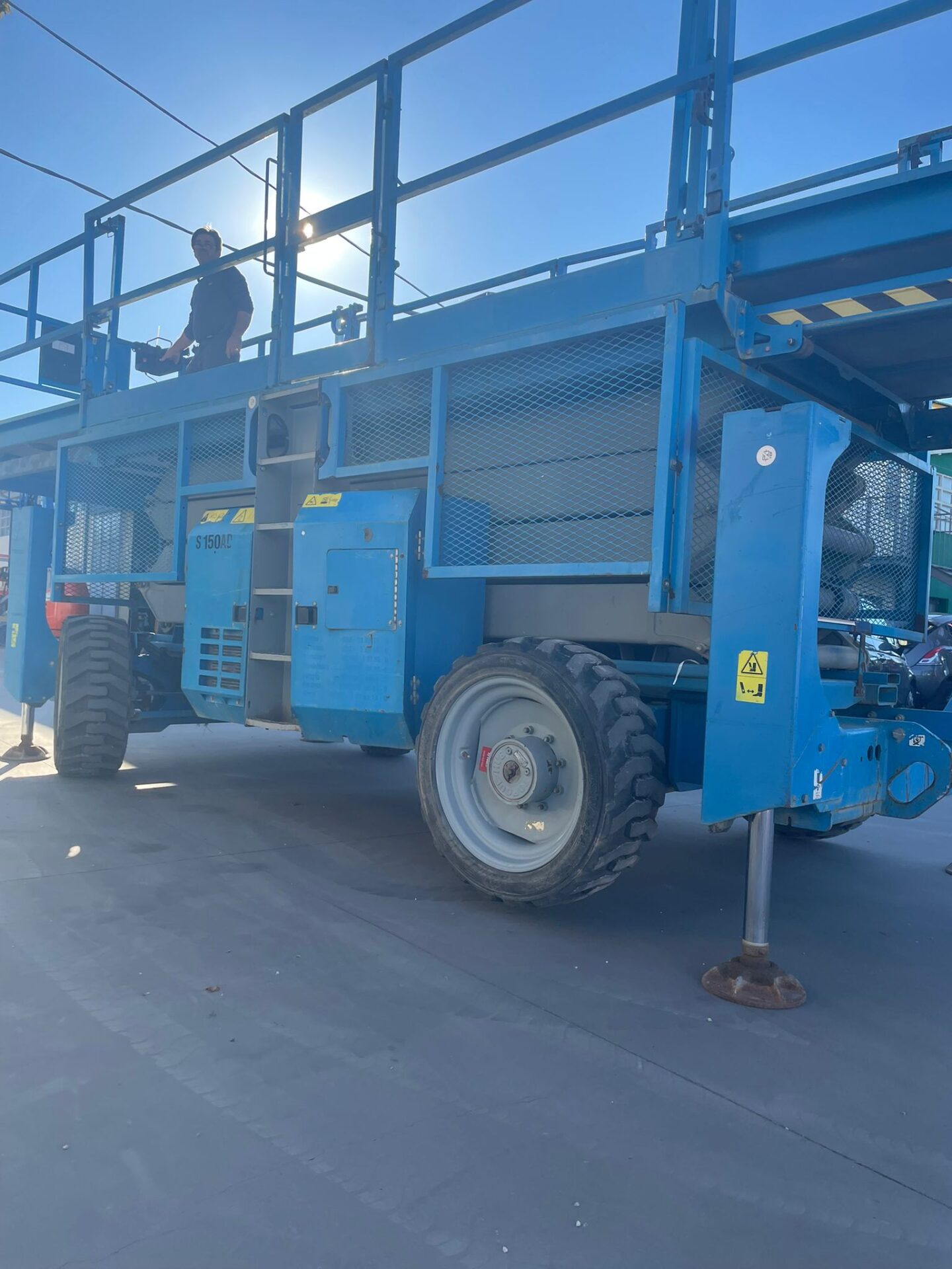 Piattaforma aerea usata verticale a pantografo diesel GENIE GS-4390, raggiunge 15mt di lavoro, anno 2009, con stabilizzatori e ruote 4×4, adatta su ogni tipologia di terreno.
