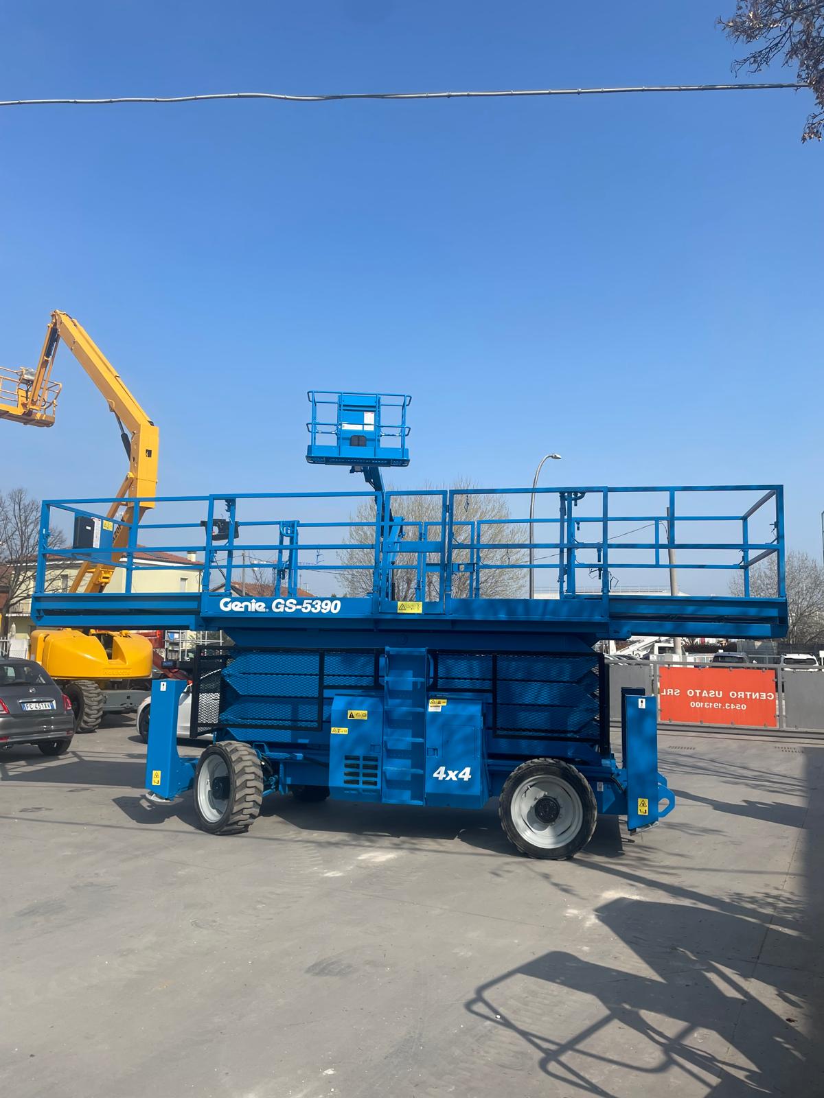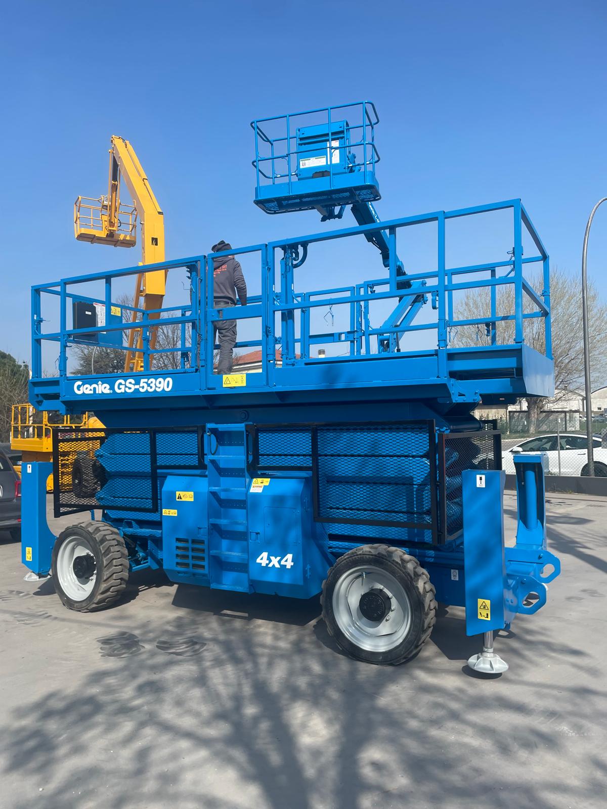 Piattaforma aerea usata verticale a pantografo diesel GENIE GS-5390, raggiunge 18mt di lavoro con stabilizzatori e ruote 4×4, adatta su ogni tipologia di terreno.