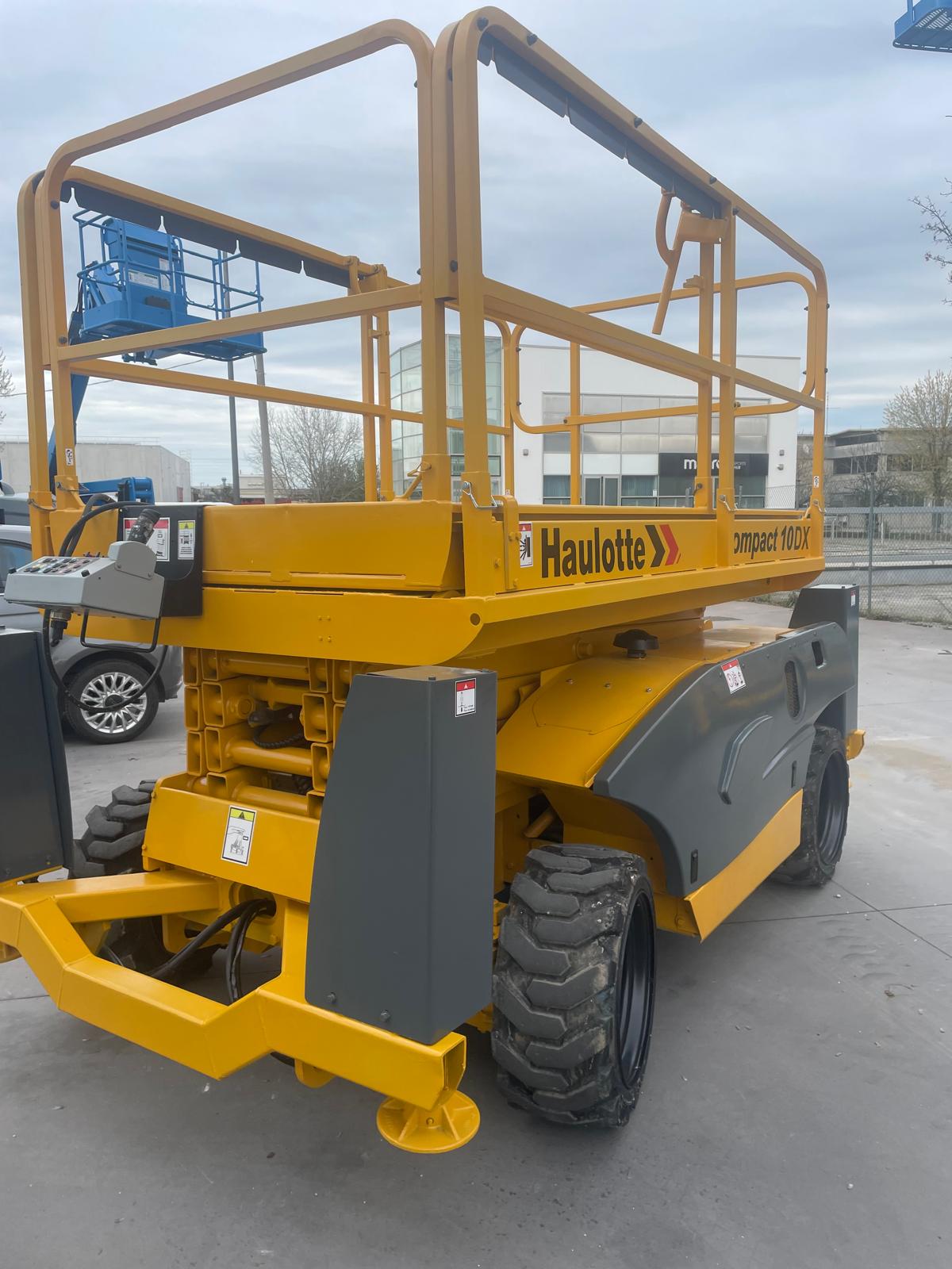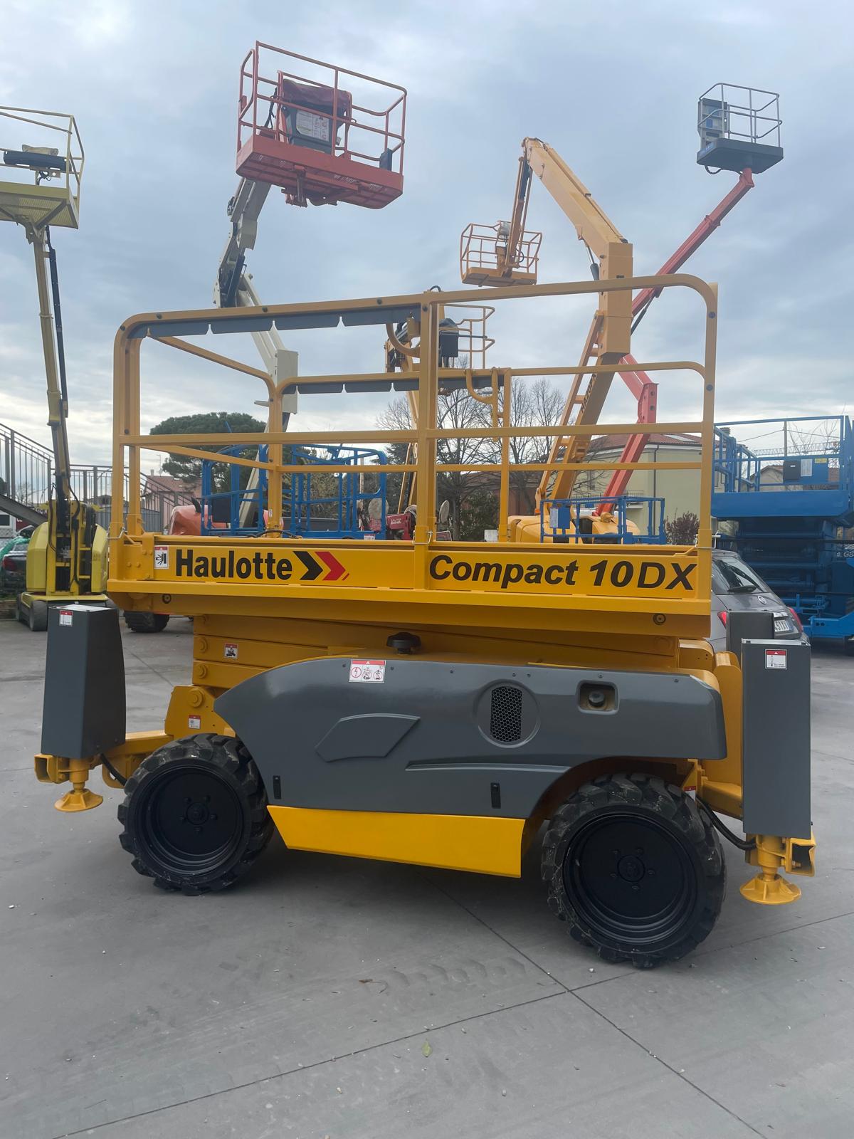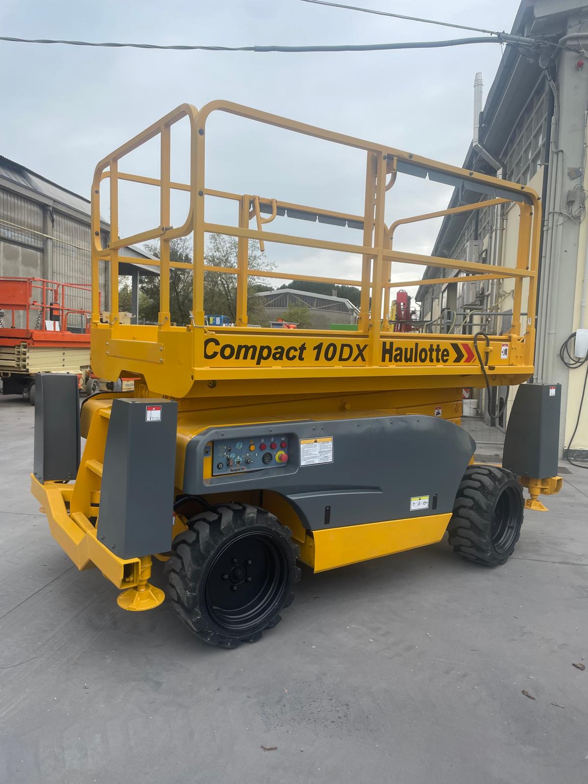 Piattaforma aerea verticale HAULOTTE COMPACT 10DX, raggiunge 8mt al calpestio / 10mt di lavoro. Diesel con stabilizzatori e gomme trazione 4×4, adatta su tutti i terreni.