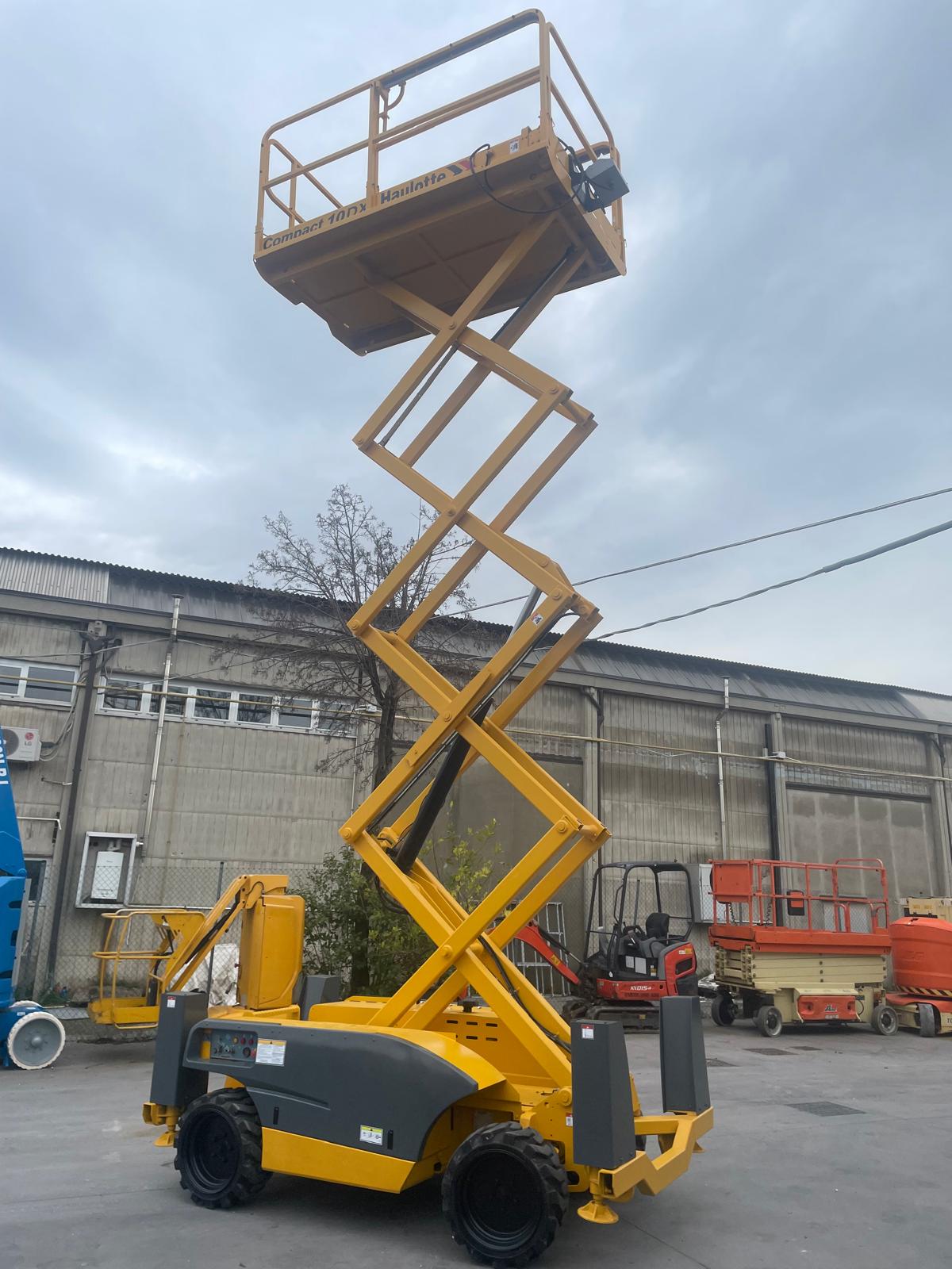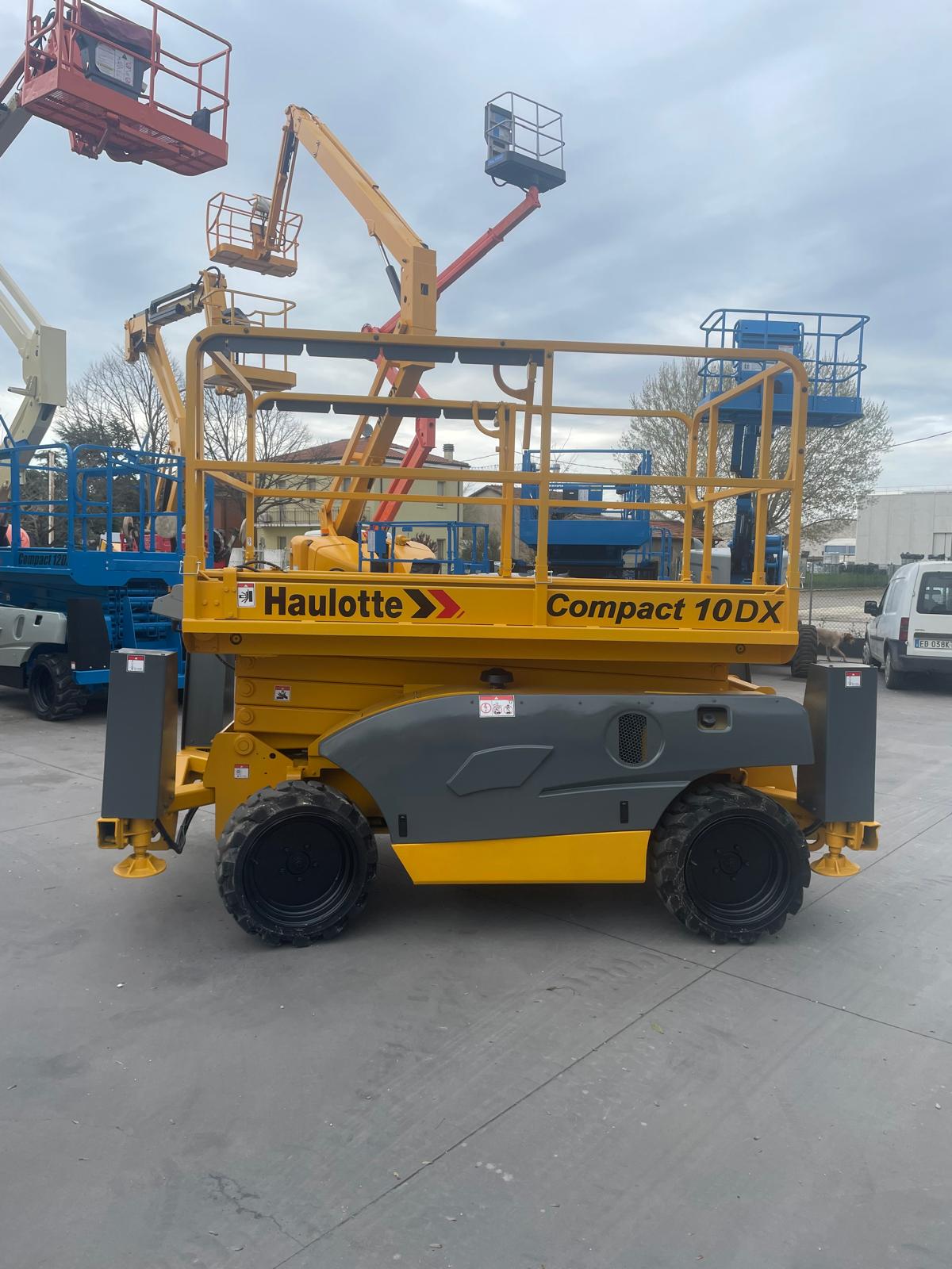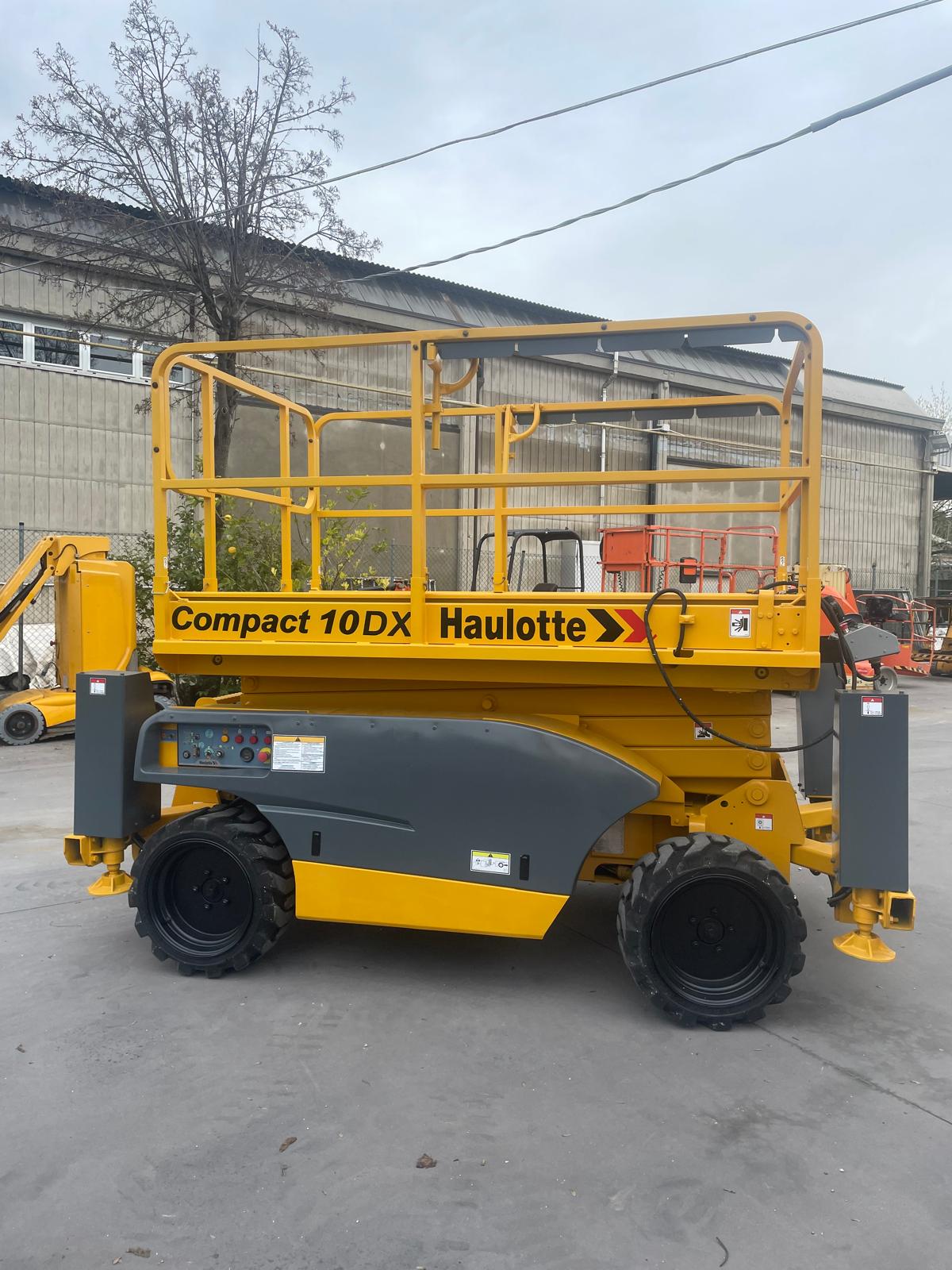 Piattaforma aerea verticale HAULOTTE COMPACT 10DX, raggiunge 8mt al calpestio / 10mt di lavoro. Diesel con stabilizzatori e gomme trazione 4×4, adatta su tutti i terreni.