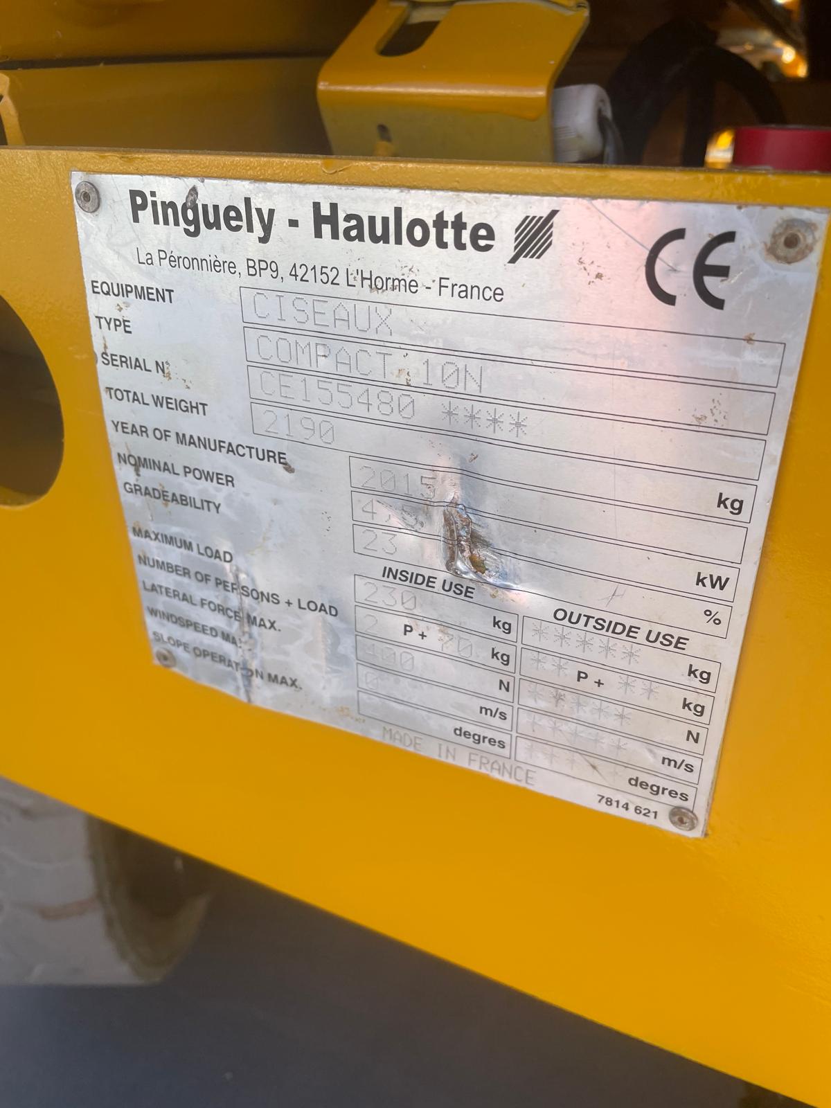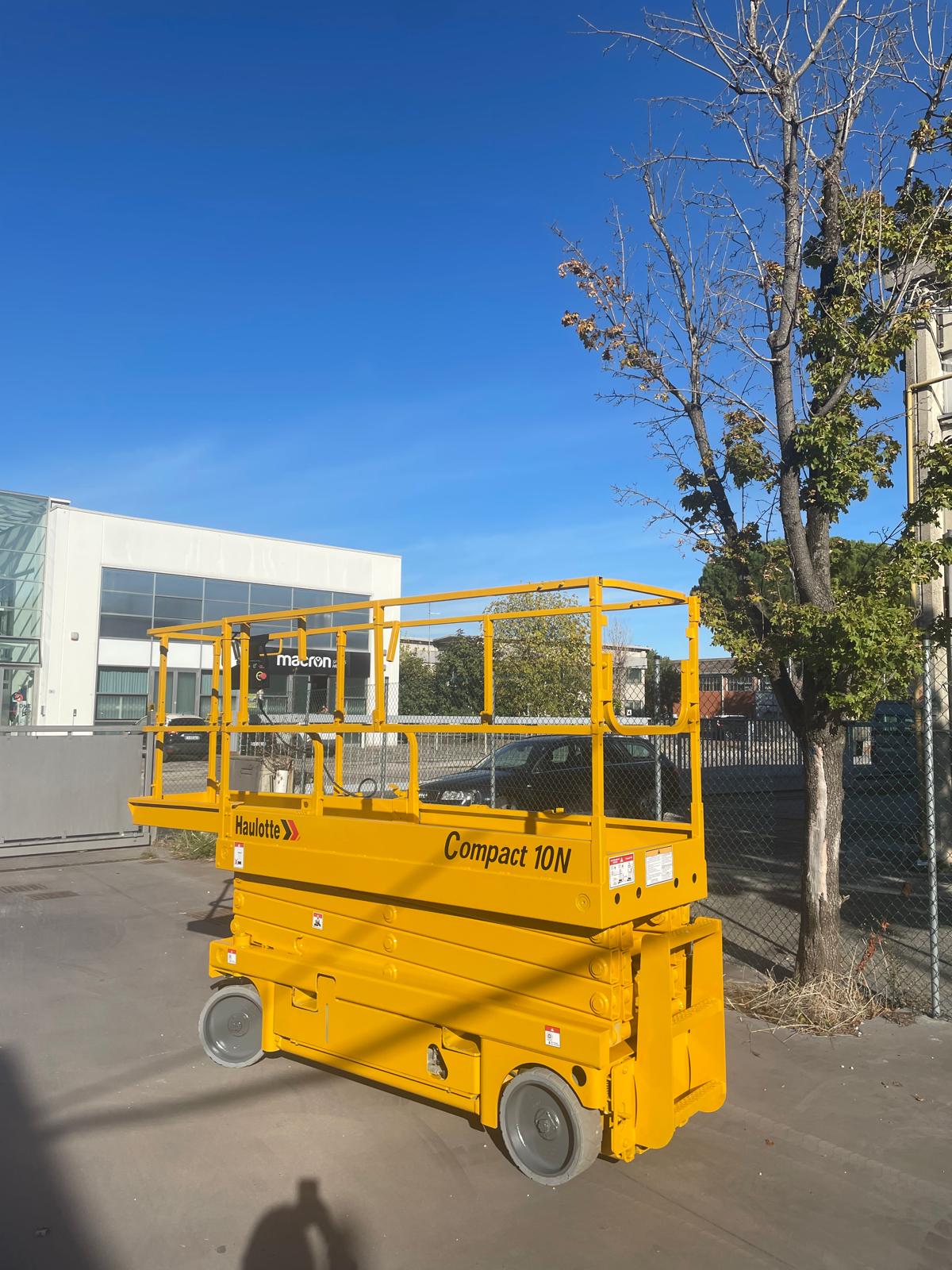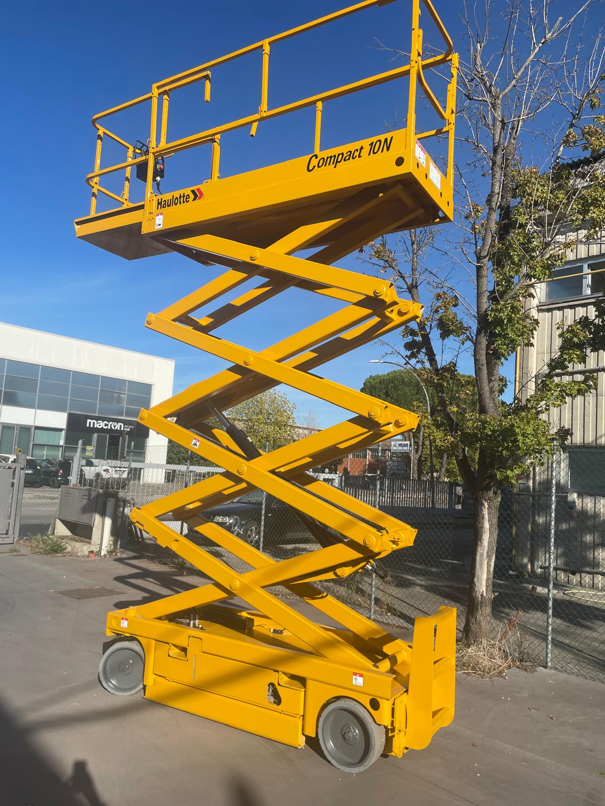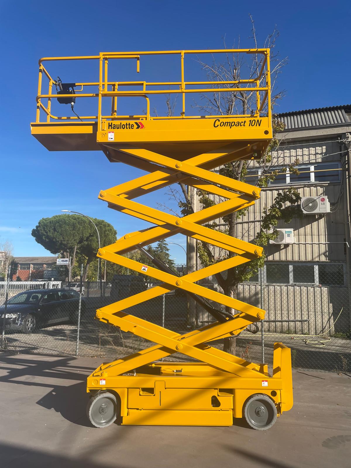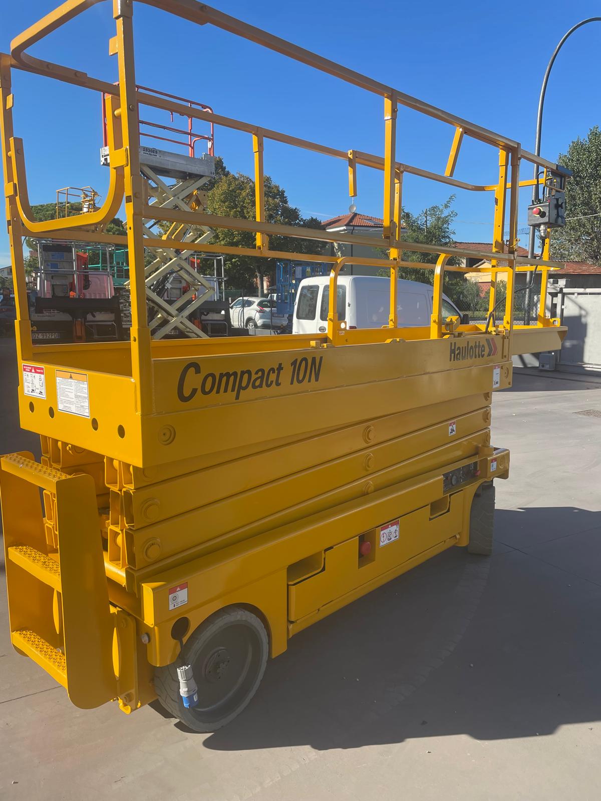 Piattaforma aerea HAULOTTE COMPACT 10N usata, verticale a pantografo elettrica con ruote bianche antitraccia. Anno 2015, raggiunge 8mt al calpestio / 10 mt di lavoro.