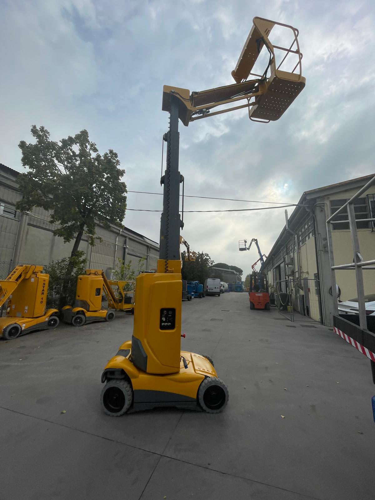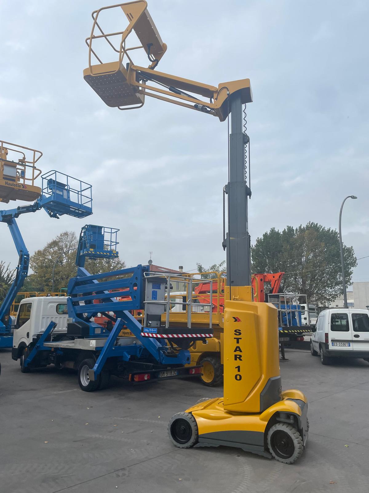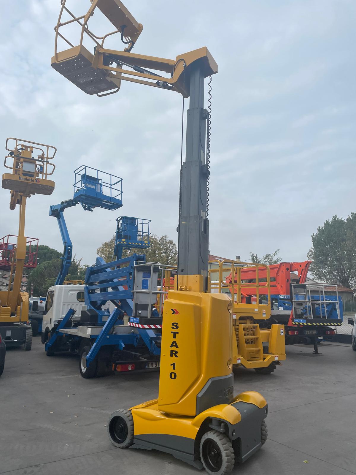 Piattaforma aerea usata elettrica a colonna HAULOTTE STAR 10, anno 2014, raggiunge 10mt di lavoro con uno sbraccio massimo di 3mt, torretta girevole e con dimensioni compatte.