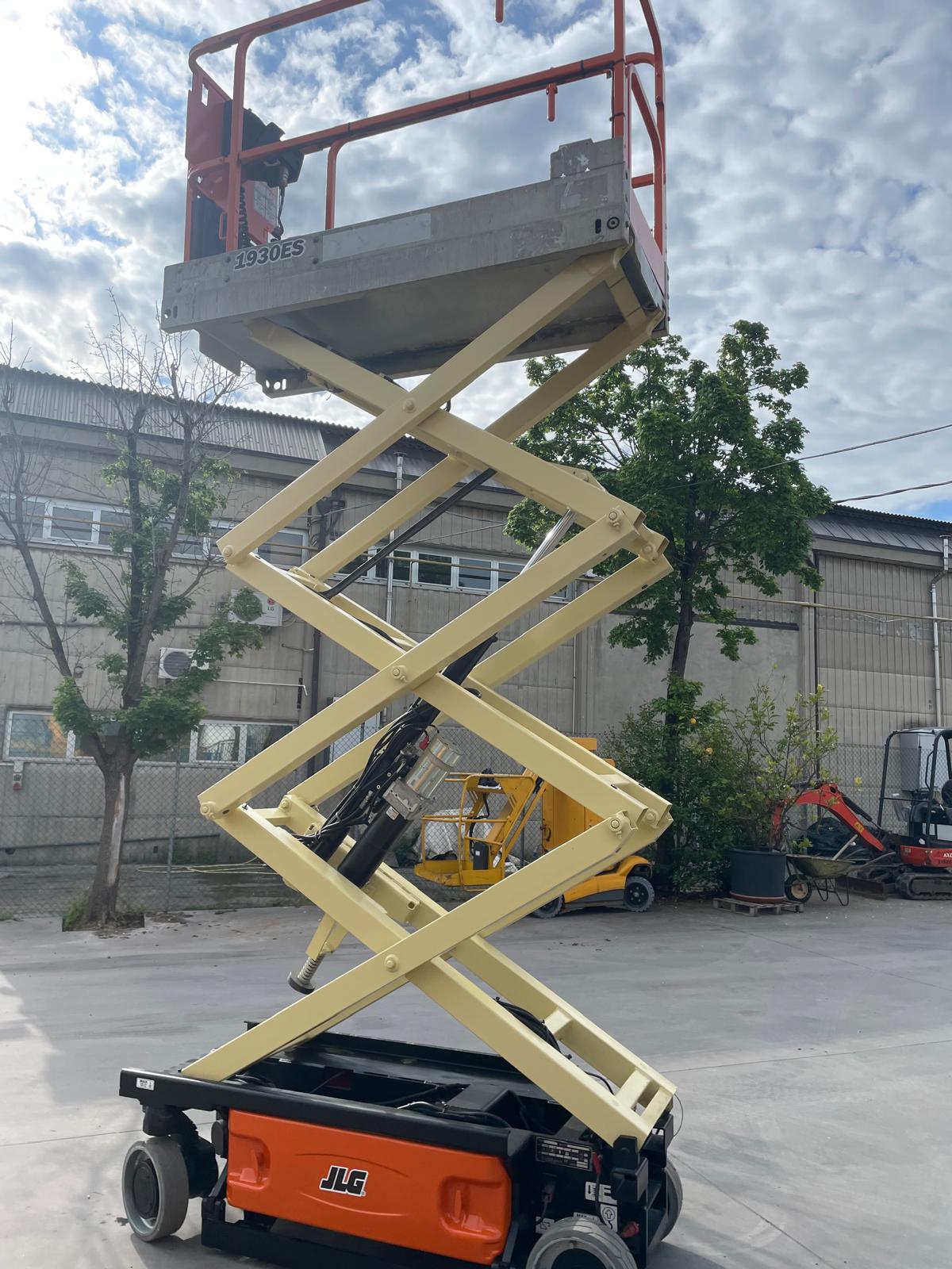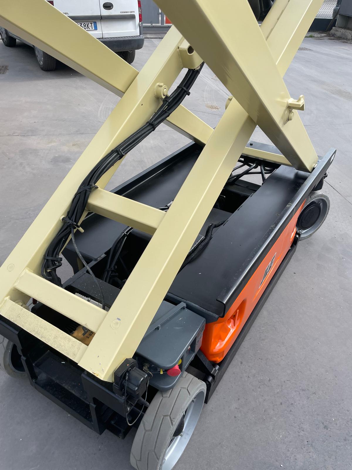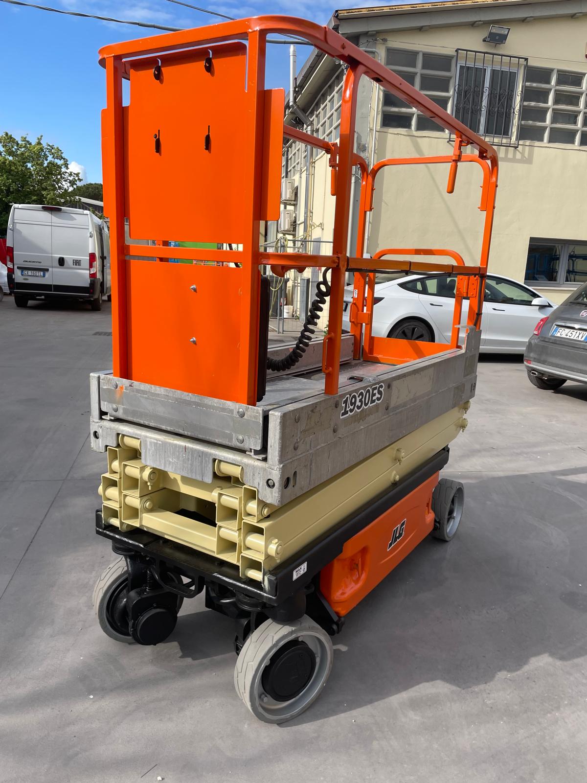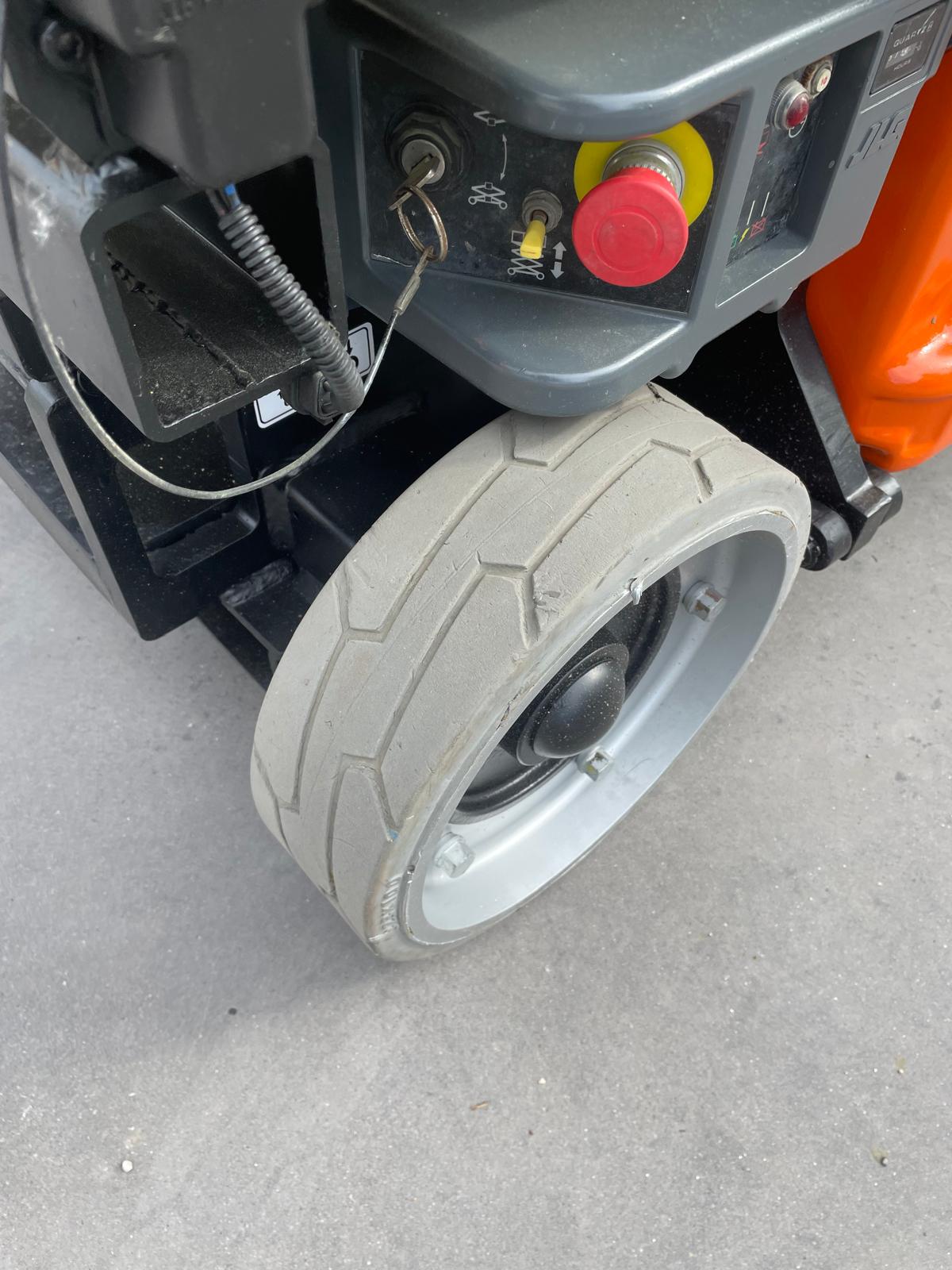 Piattaforma aerea usata JLG 1930ES, verticale a pantografo elettrica con ruote bianche antitraccia.