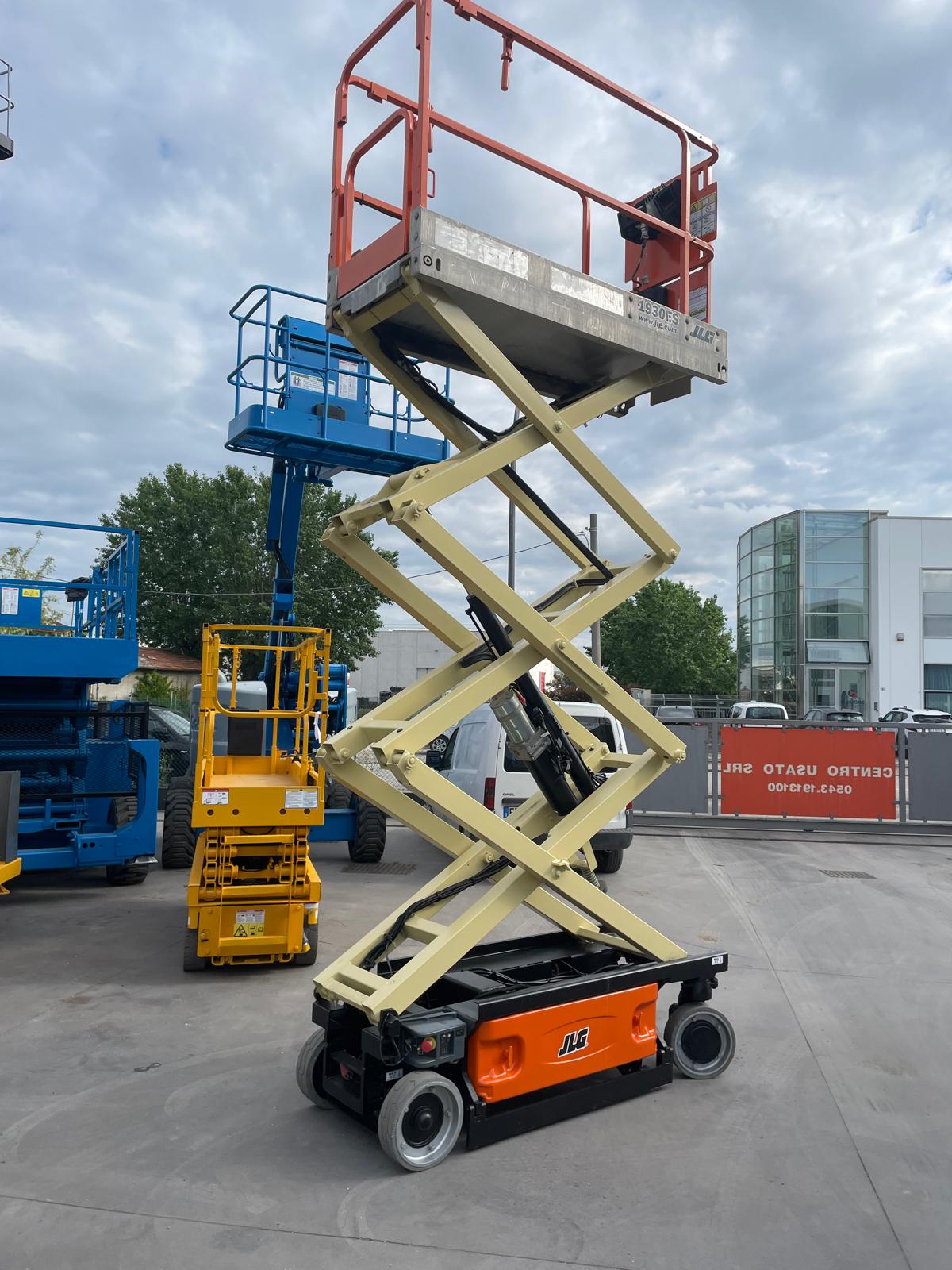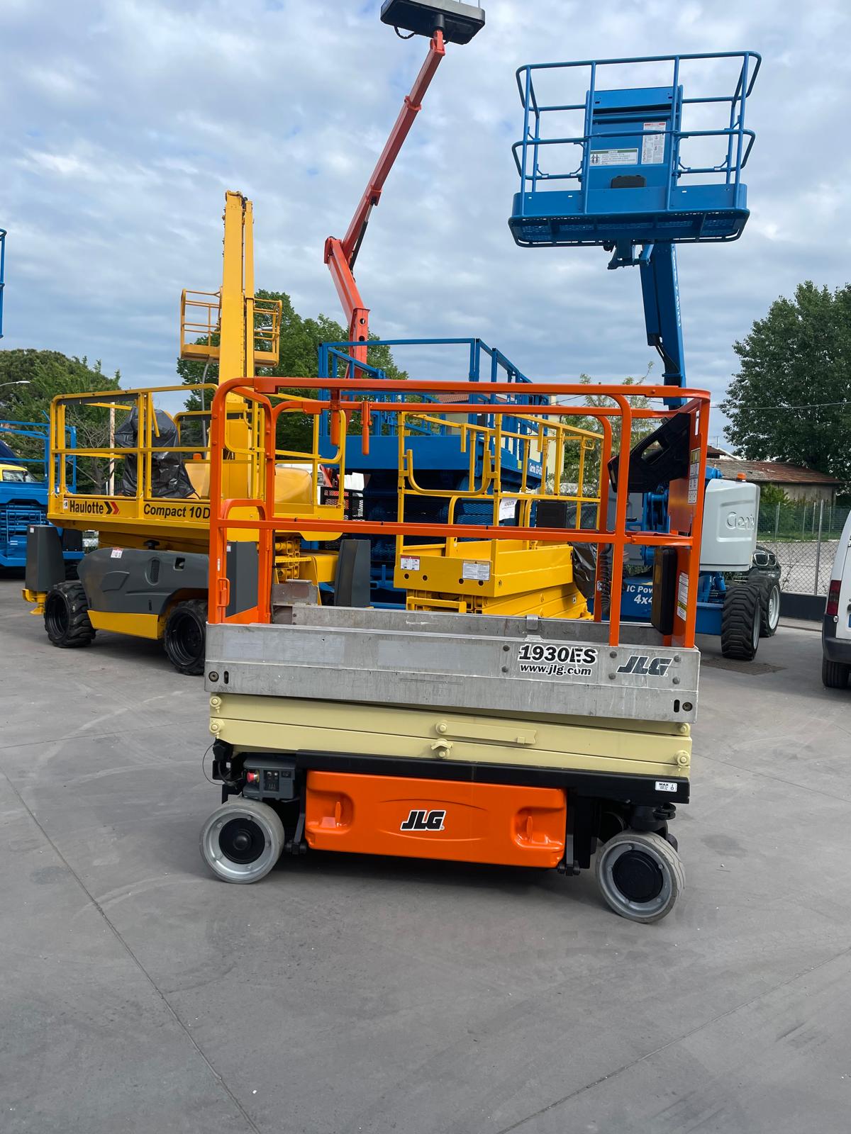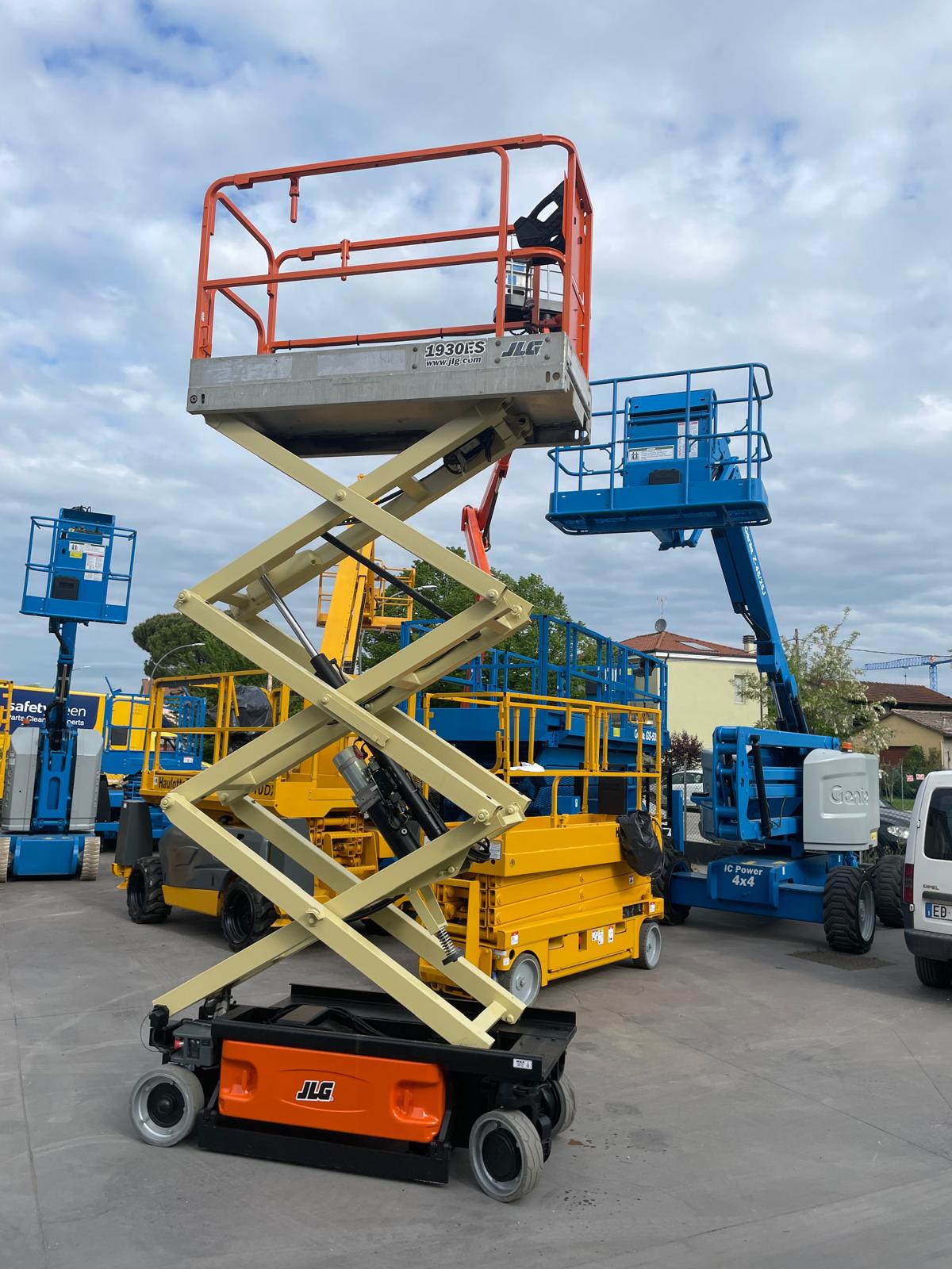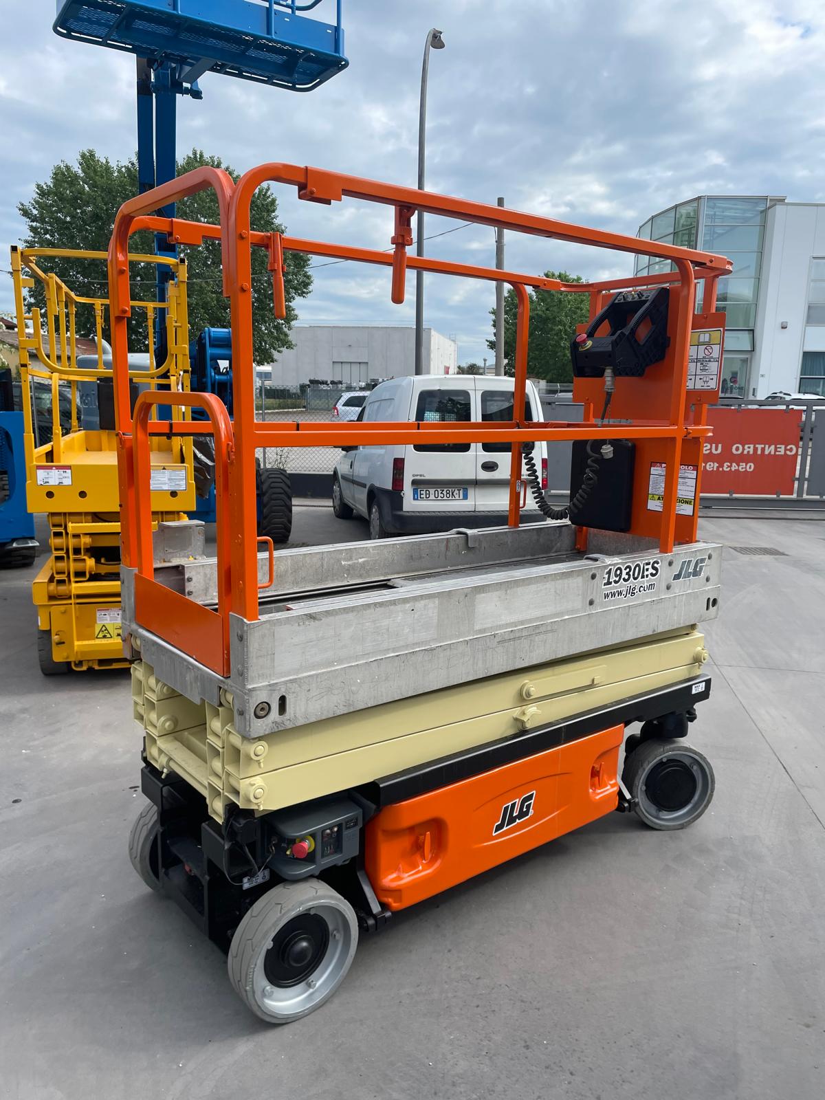 Piattaforma aerea usata JLG 1930ES, verticale a pantografo elettrica con ruote bianche antitraccia.