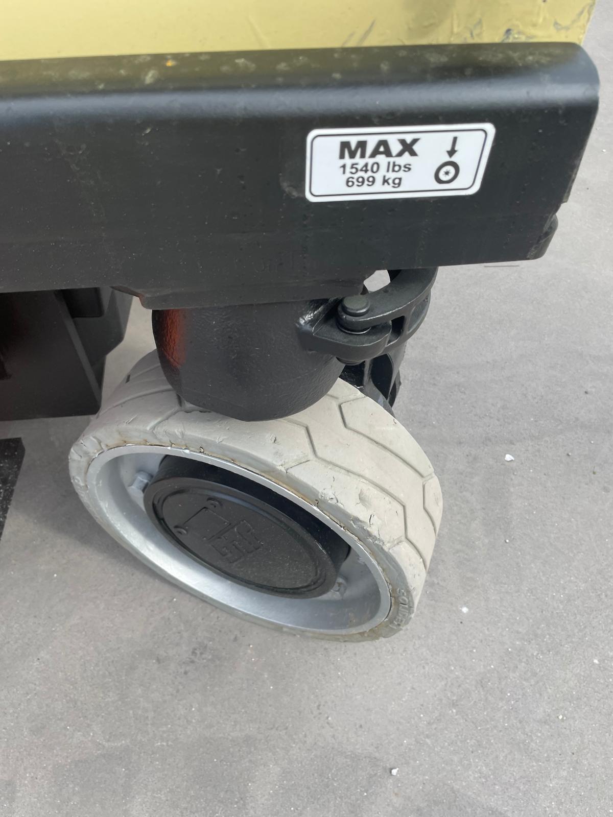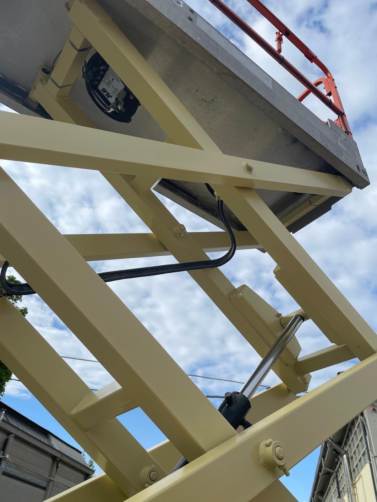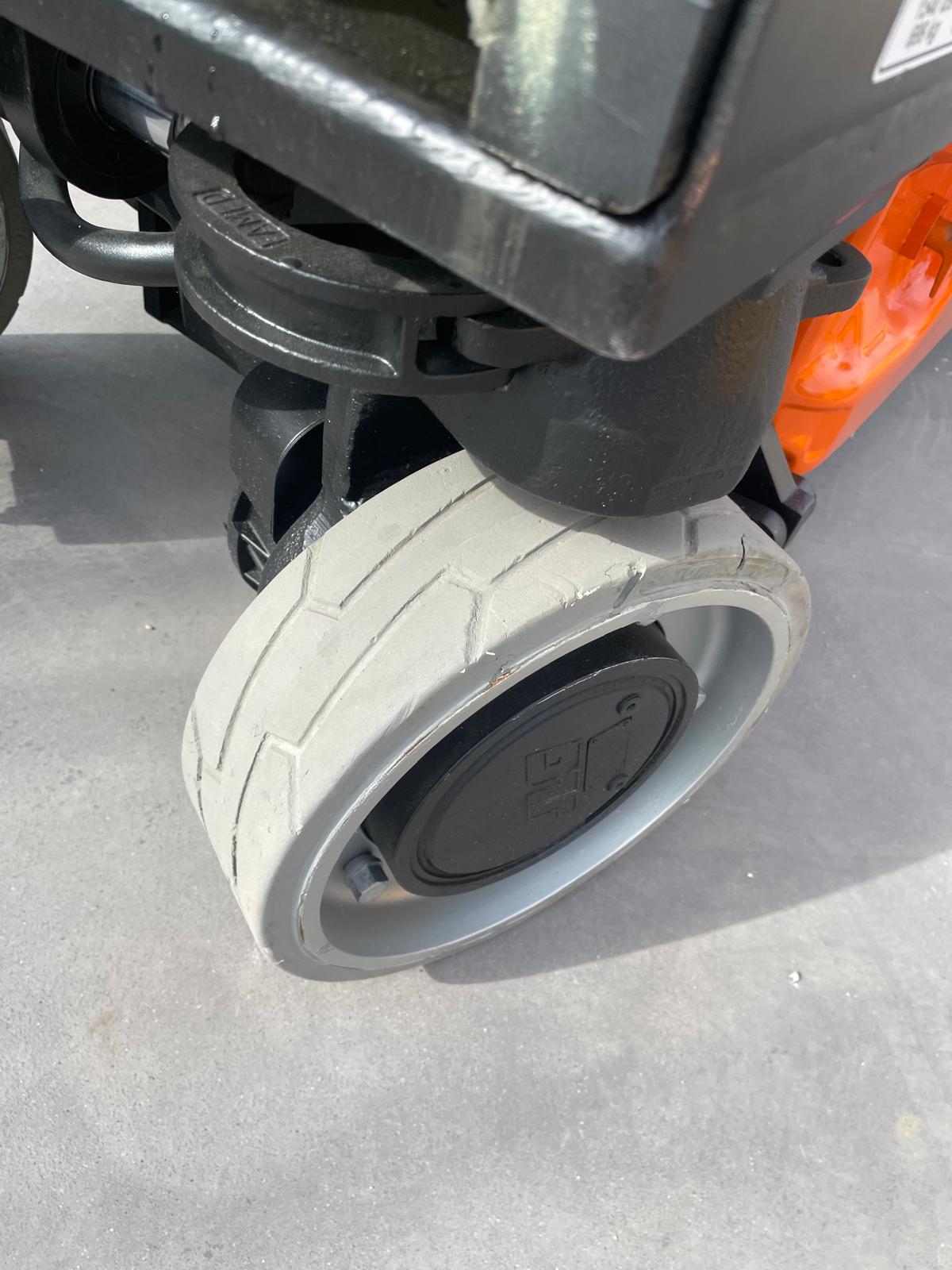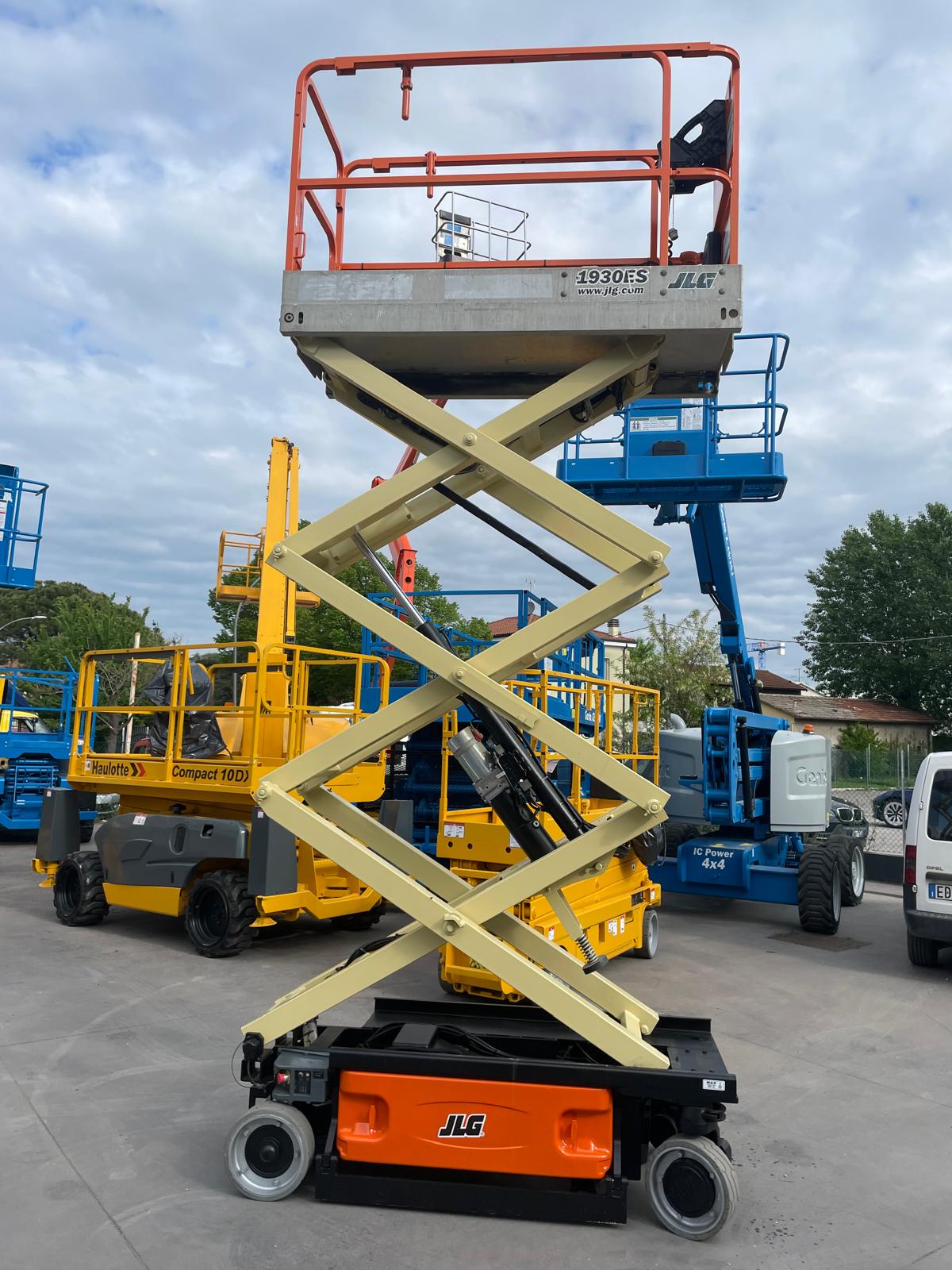Piattaforma aerea usata JLG 1930ES, verticale a pantografo elettrica con ruote bianche antitraccia.
